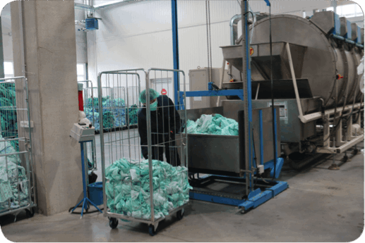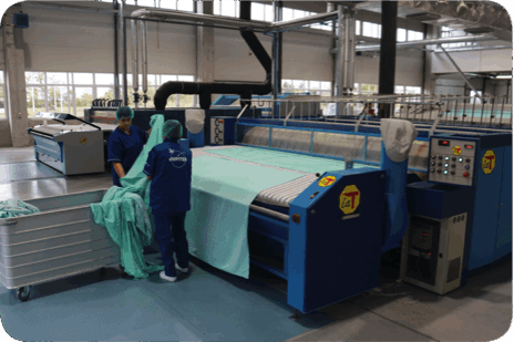Prljavi veš naših klijenata nakon pristizanja se istovara u zoni zaprljanog veša. Bolnički veš se pere u tunel mašini od 10 komora, kapaciteta 50kg. Svakoj od komora dodeljuje se odgovarajući program za pranje, koji se podešava shodno vrsti tkanine i zaprljanosti veša.
