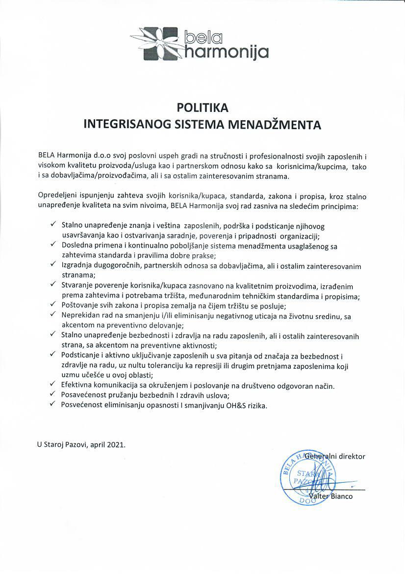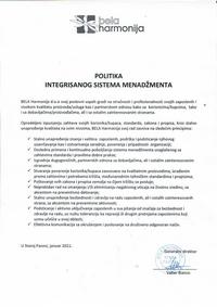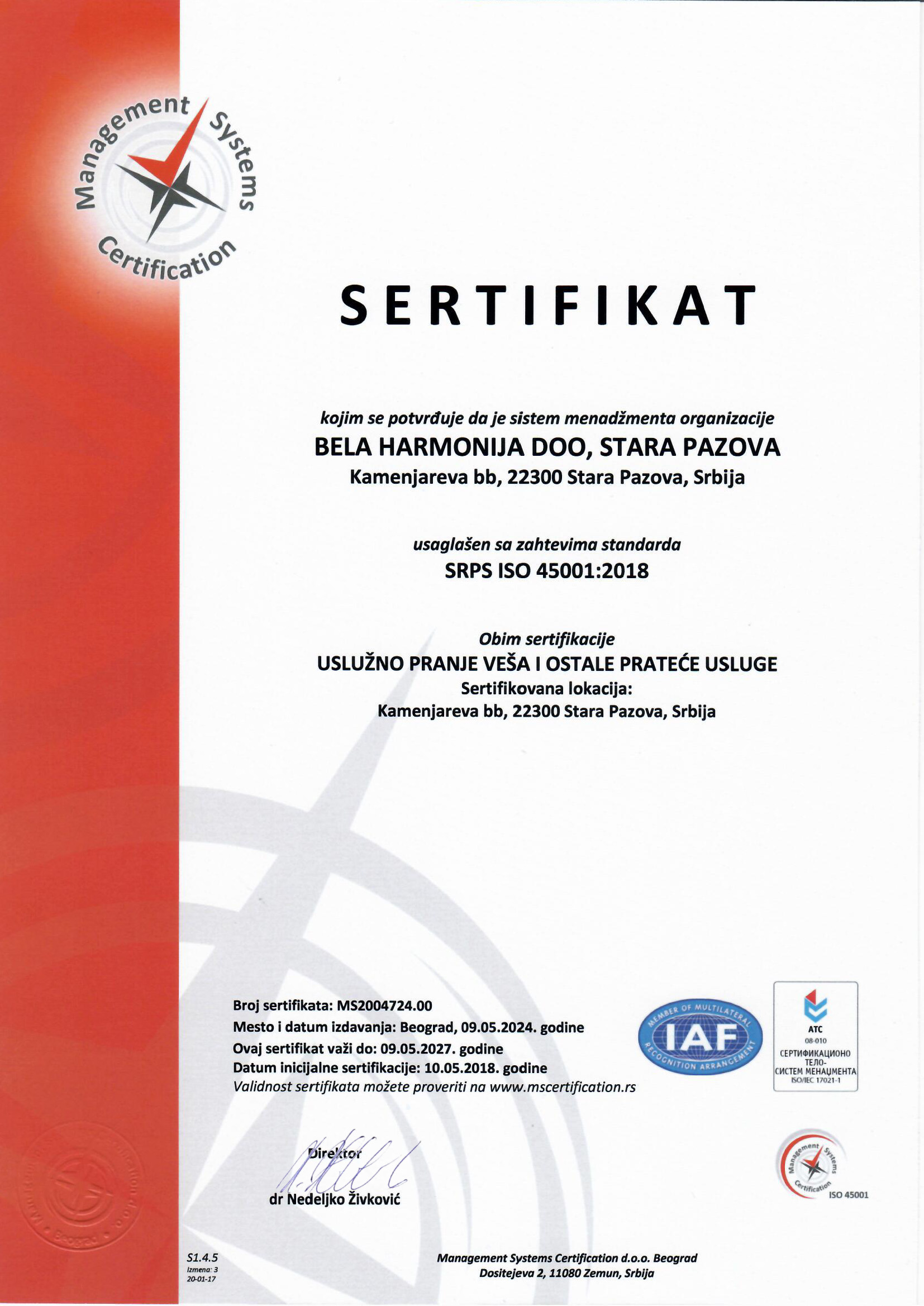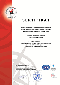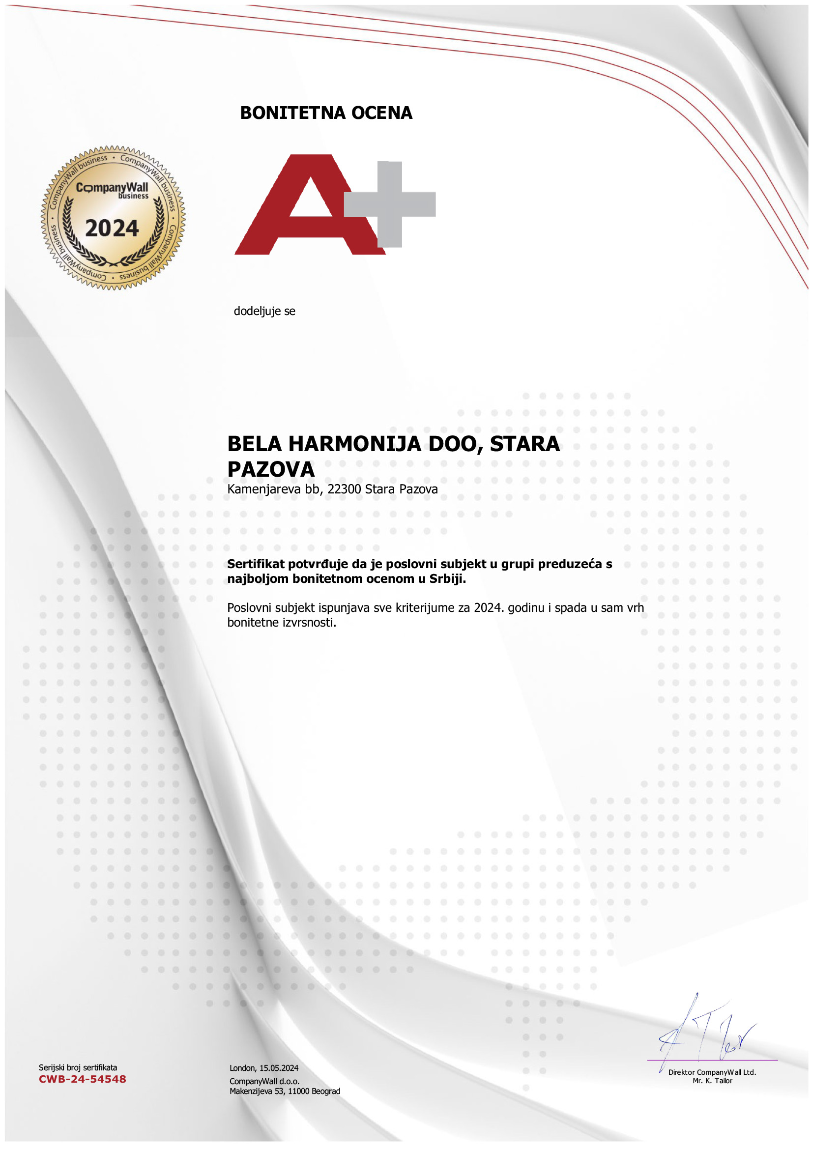 Kompanija Bela Harmonija je sertifikovana sledećim sertifikatima: